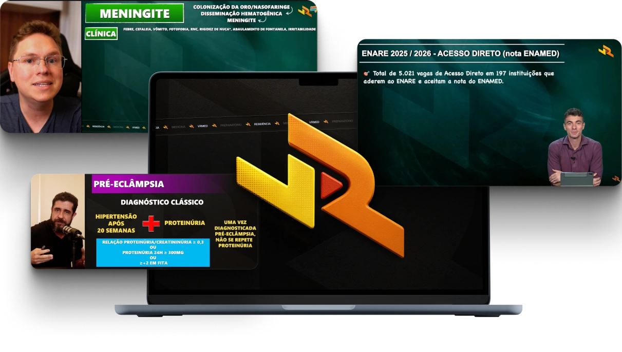 Cada tema dentro do VR MED é estruturado em três tipos de aula, para garantir que você estude com profundidade, estratégia e eficiência, sempre de acordo com o peso real de cada assunto nas provas de residência que você vai enfrentar.